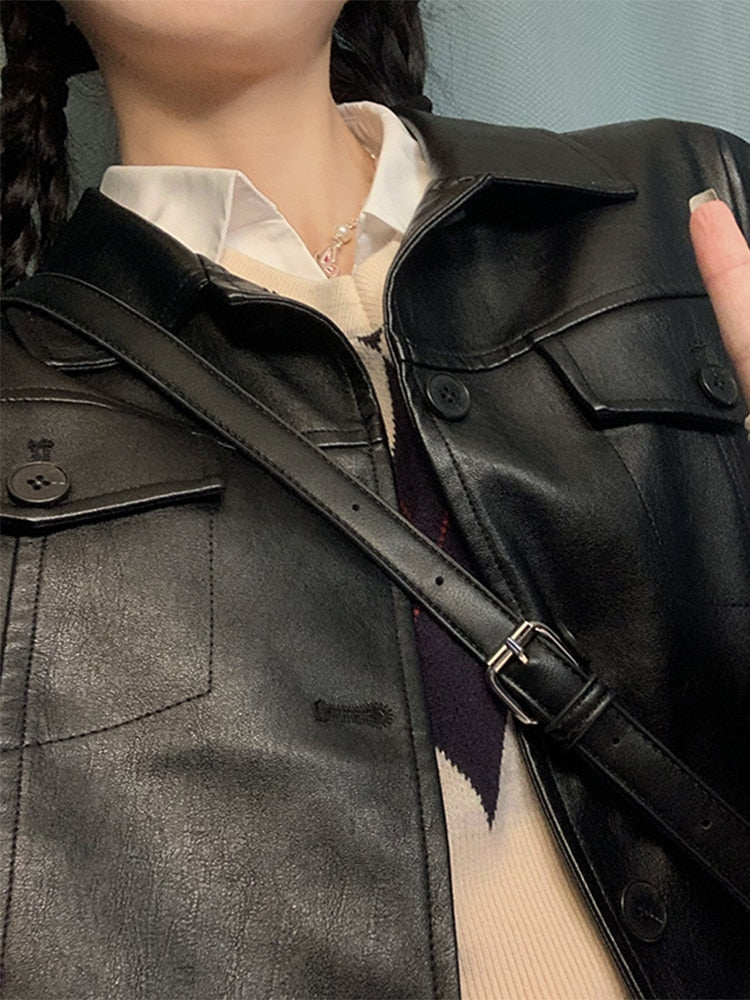 - Crafted from faux leather and PU, this short-length jacket features a turn-down collar, single-breasted closure, and practical pockets for a chic yet functional appeal.